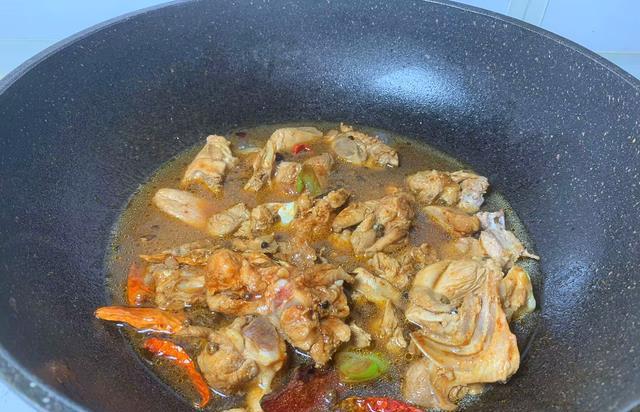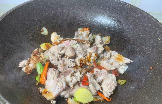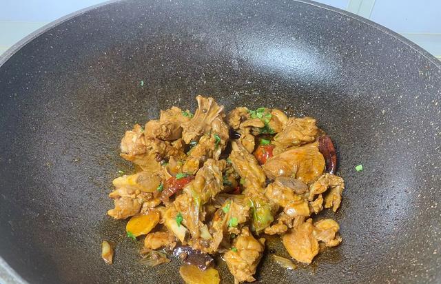 3、起锅烧油,把所有的调料品放入锅中炒出香味,再放入沥干水分的鸭肉,大火翻炒均匀,锁住鸭肉的水分,随后倒入少许酱油上色、1勺味达美、1小时白糖和盐进行翻炒调味。
