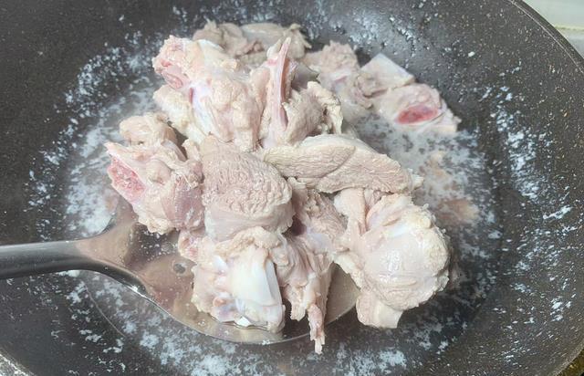 2、小编不喜欢吃鸭皮,直接扒掉了,这样吃起来不油腻。把去皮的鸭肉剁成小块,用清水冲洗干净血水,再放入冷水锅内,焯水煮出血沫,捞出控水备用。